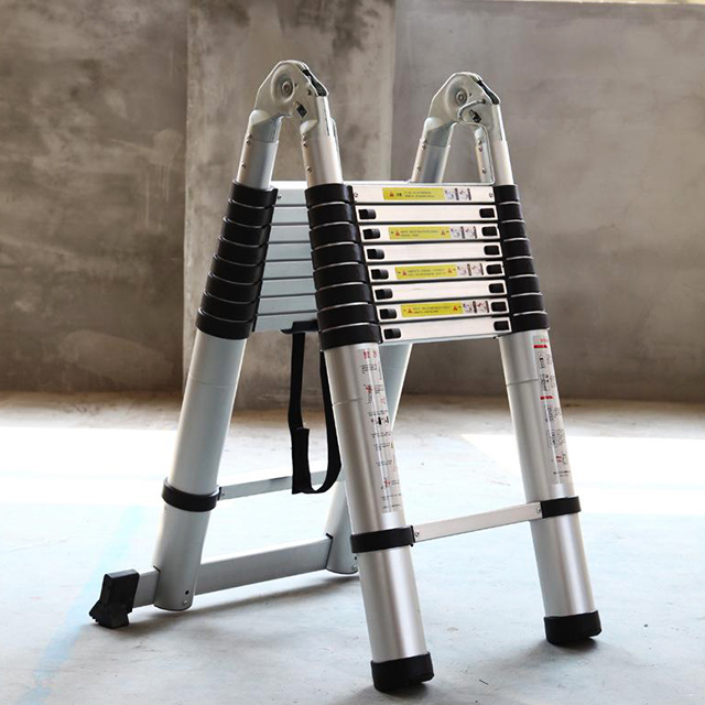 Dual telescopic ladder with hinge Length: 4.4m Step number: 2*7 steps Spacing between steps: 30cm Weight: approximately 16.2kg Max Load: 150kgs